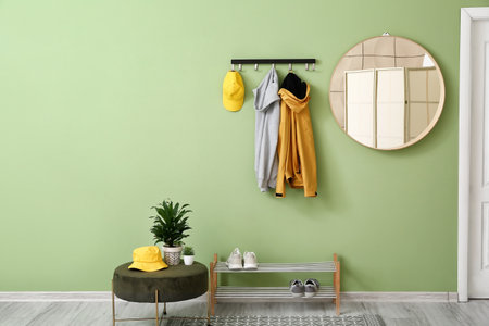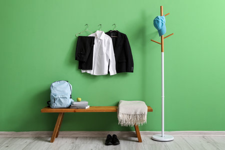 Rack with cap, bench, backpack, shoes and stylish school uniform hanging on green wall in room
