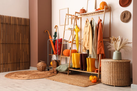 Wicker table, pumpkins, rack with clothes and umbrellas in interior of hallway