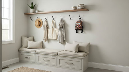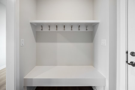 Interior of a white mud room with white door, built-in white bench and wall mounted hooks and shelf