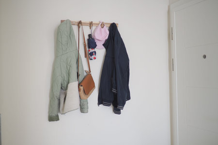 Blue and yellow jackets hanging on pink wall in stylish hallway