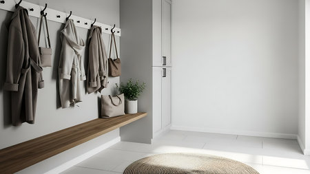Organized Modern Mudroom with Coats Hanging on Hooks and Wooden Bench