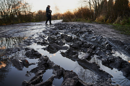 a woman in front of an impassable section of a broken dirt road with no sidewalk. Large puddles, terrible mud, deep traces of car protections, real off-road.