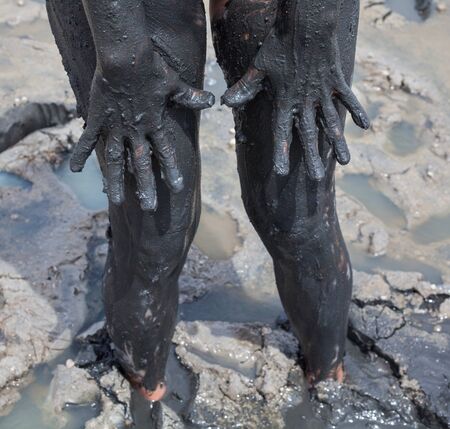 The girl rubs her leg with medicinal black mud from the lake. Healing salt lake in the Crimea.