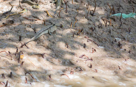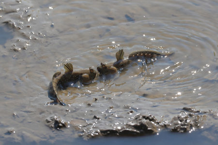 Mud-skippers guarding and fighting for their territory in the wet and low tide of the mangrove tree area in Malaysia