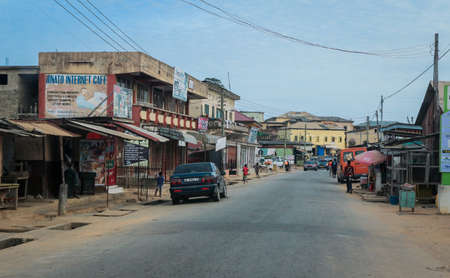 Cape Coast, Ghana - April 14, 2022: Cityscape of Local African Cape Coast town with Ghana People and Cars on the street