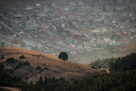Bulgarian town - Sarnica. Rhodope mountains. Fog , Clouds , Sunset.