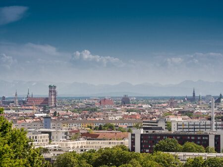 Beautiful aerial view over the bavarian metropole city Munich with the alps mouintains in the background. Total panoramic view over the authentic cityscape.