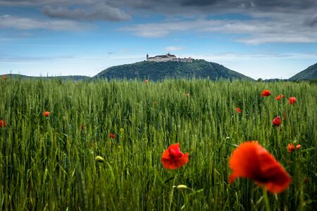 Poppies in the wheat canopy in background Monastery Goettweig, Wachau region,Austria