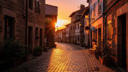 A golden sunset casts long shadows across a cobblestone street lined with buildings. The scene showcases architectural details with a warm color palette. The composition employs strong perspective, highlighting the textures. Suitable for illustrating various concepts and designs, the image is ideal for commercial applications.