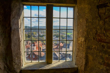 Windows in medieval gothic castle Trosky at two basalt volcanic plugs, tower on hill in sunny day, fortress walls, fairytale stronghold, ancient ruin, Bohemian Paradise, Czech Republic, May 08, 2021
