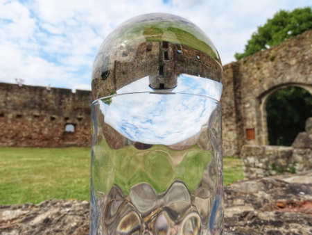 Medieval castle ruin in Pettingen, Luxembourg seen through crystal ball. The cut glass holder further distorts the image inside the ball