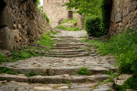 A winding cobblestone pathway leads through a quaint village, surrounded by stone walls adorned with greenery. The atmosphere is serene, showing nature and history.