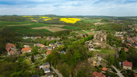 Stunning Aerial View of a Magnificent Ancient Castle Enveloped by Verdant Lush Landscapes. Hanstein castle, Germany.