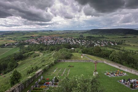 Wall of the castle ruin Hohenrechberg and view over the beautiful swabian alp, Germany