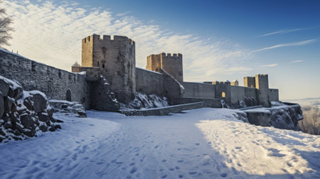 A historic stone castle under a blanket of snow
