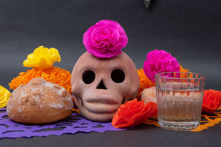 Mexican Day of the dead altar with traditional bread, colorful flowers, a skull, mezcal, candles and cut paper on black background