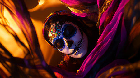 Vibrant day of the dead celebration with intricate face paint and flowing fabrics