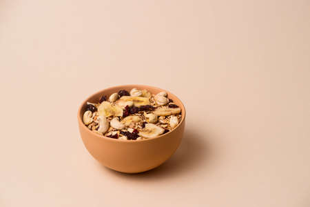 A fresh granola with dried and candied nuts and fruits in beige colour bowl closeup on beige bakground. Concept of nutrient and healty breakfast or meal