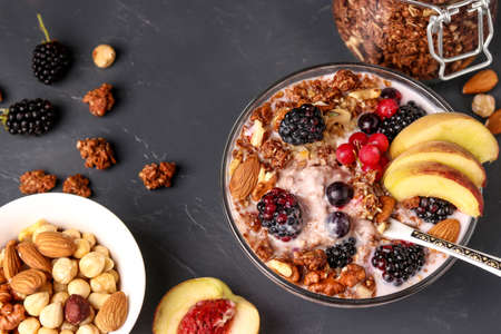 Healthy food concept with oatmeal on dark rustic background with copyspace