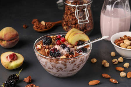 Granola crispy honey muesli with natural yogurt, fresh berries and fruit, chocolate and nuts in a glass bowl against a dark background, Healthy food, Closeup, Horizontal orientation