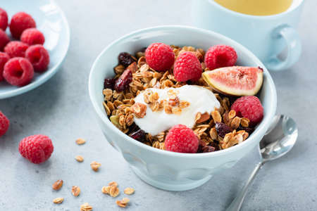 Granola with yogurt, berries and fruits in bowl. Healthy tasty breakfast with yogurt, homemade granola, fresh raspberries and figs. Cup of green tea on background