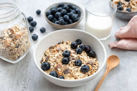 Breakfast cereals in bowl served with almond milk and blueberries. Clean eating, healthy food diet concept