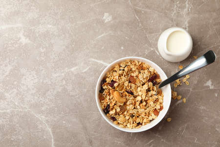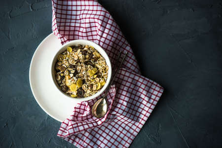 Homemade granola in a white bowl, gray background, top view, copy space. Muesli bowl for a healthy breakfast.