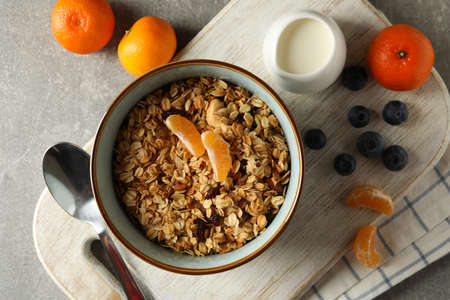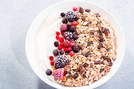 Muesli bowl or granola bowl with yogurt and berries on concrete table top. Healthy breakfast, top view