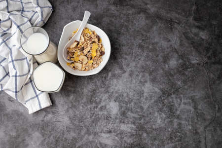 Breakfast ingredients. Cereals with milk on cement texture background.