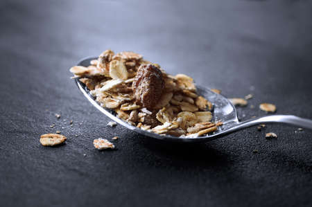 Beakfast cereals in wooden scoop. Healthy muesli with oat flakes, nuts and raisins