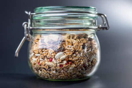 Multigrain organic granola with nuts and dried berries on the black background close up taken with copy space.