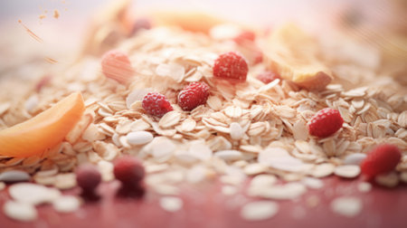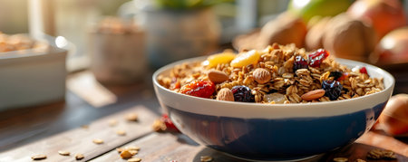 Mouth watering granola with an assortment of dried fruits and crunchy nuts perfectly showcased in a soft natural sunlit setting on a simple wooden table
