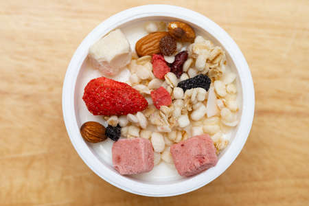 Frozen strawberry with granola, almond flakes, cream on concrete table