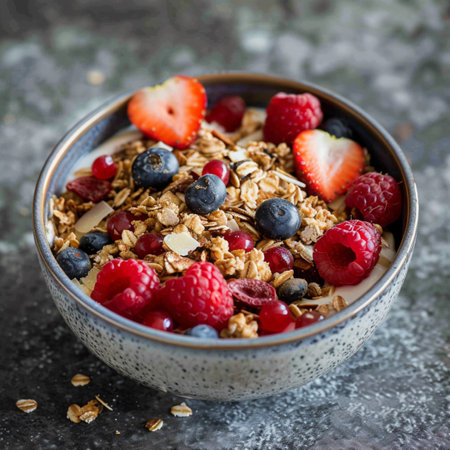 Oatmeal porridge in bowl topped with fresh berries, and homemade crunchy granola