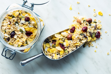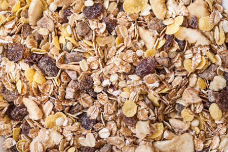 delicious granola muesli with nuts and raising pattern, flat lay. healthy breakfast concept. cereal meal