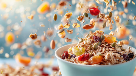 A close-up of a bowl filled with healthy muesli, including dried apricots, raisins, almonds, and oats, against a soft blue background.