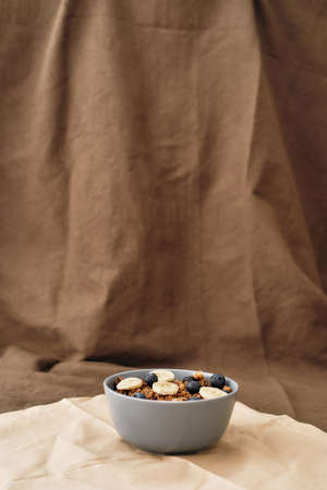 Homemade granola in a plate with nuts, honey, blueberries, banana and other natural ingredients served on napkin over brown background