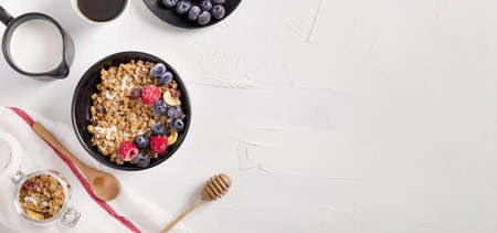 Classic breakfast - granola with honey, yogurt and berries on a white wooden background. View from above.