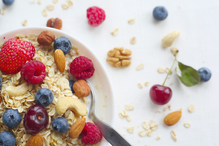 Healthy breakfast bowl with oatmeal, berries and fruits on white background