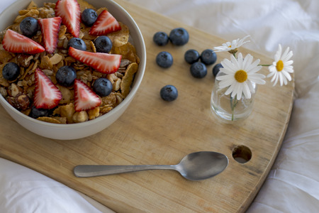 Granola bowl with fresh strawberries and blueberries on wooden table. Flat lay, concept of healthy lifestyle, healthy eating, dieting and balanced meal