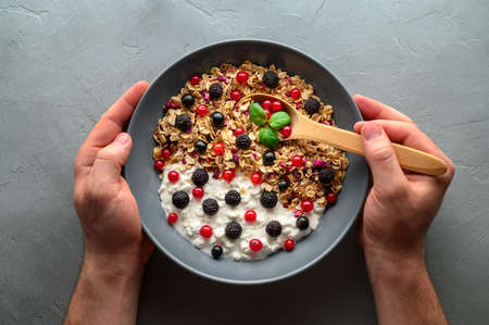 Healthy breakfast concept. Male hands are holding a wooden spoon and a bowl with oat granola, yogurt and black raspberries, black and red currants. Gray concrete background. Top view.