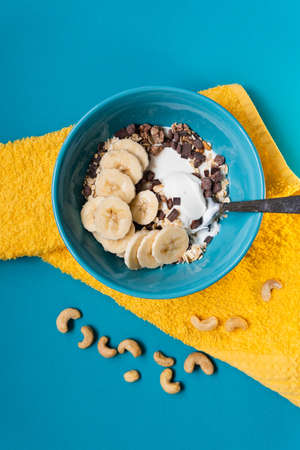 healthy breakfast. appetizing healthy granola in bowl on blue wooden background