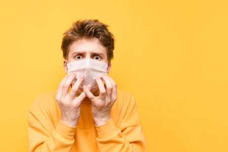 Close-up portrait of scared guy in medical mask on yellow background, looking shocked at camera. Coronavirus pandemic. Quarantine covid-19.