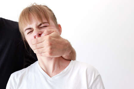 No, this cant be happening. A terrified young woman held captive by a man with his hand over her mouth.