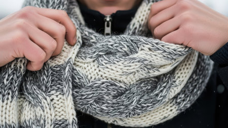 The image features a person adjusting a knitted scarf with intricate patterns. The scarf is predominantly black and white, and the person is wearing a black jacket. The image has a transparent background, making it suitable for various design applications. This SEO-friendly description highlights the key elements of the image.