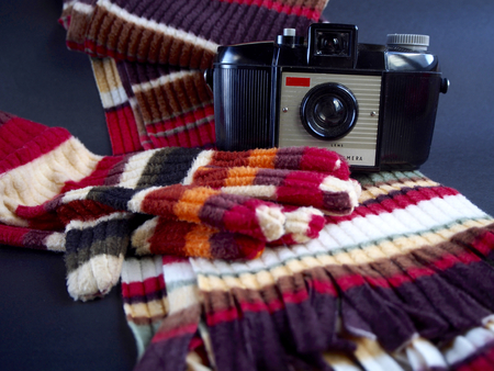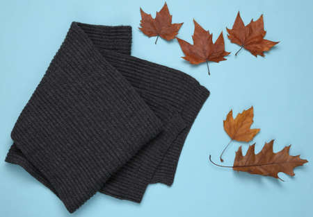 Cozy winter composition with scarf and autumn leaves on dark wooden background.