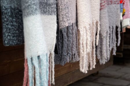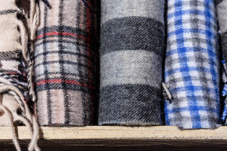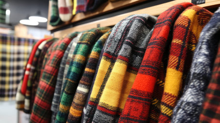 A collection of colorful woolen plaid blankets displayed in a textile store, showcasing various designs and textures perfect for warmth and style.