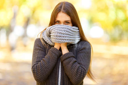 Portrait of a beautiful young woman in a warm sweater and scarf.