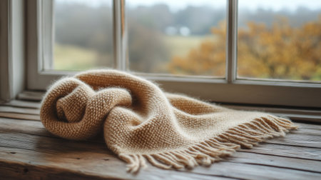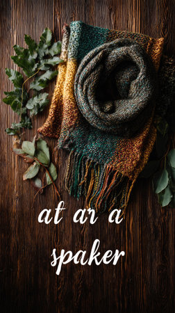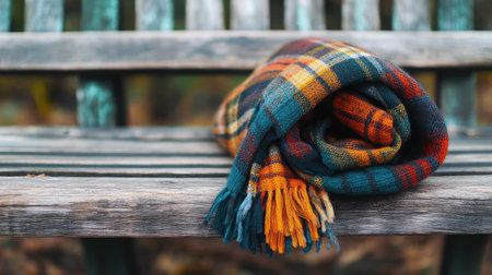 A rolled cozy scarf with vibrant colors rests on a weathered wooden bench, creating a warm and inviting atmosphere perfect for autumn outdoor relaxation.