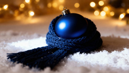 Blue ornament wrapped in a knitted scarf rests on artificial snow with warm bokeh lights in the background. Soft neutral areas around the subject provide space for text and seasonal messaging in layouts and banners